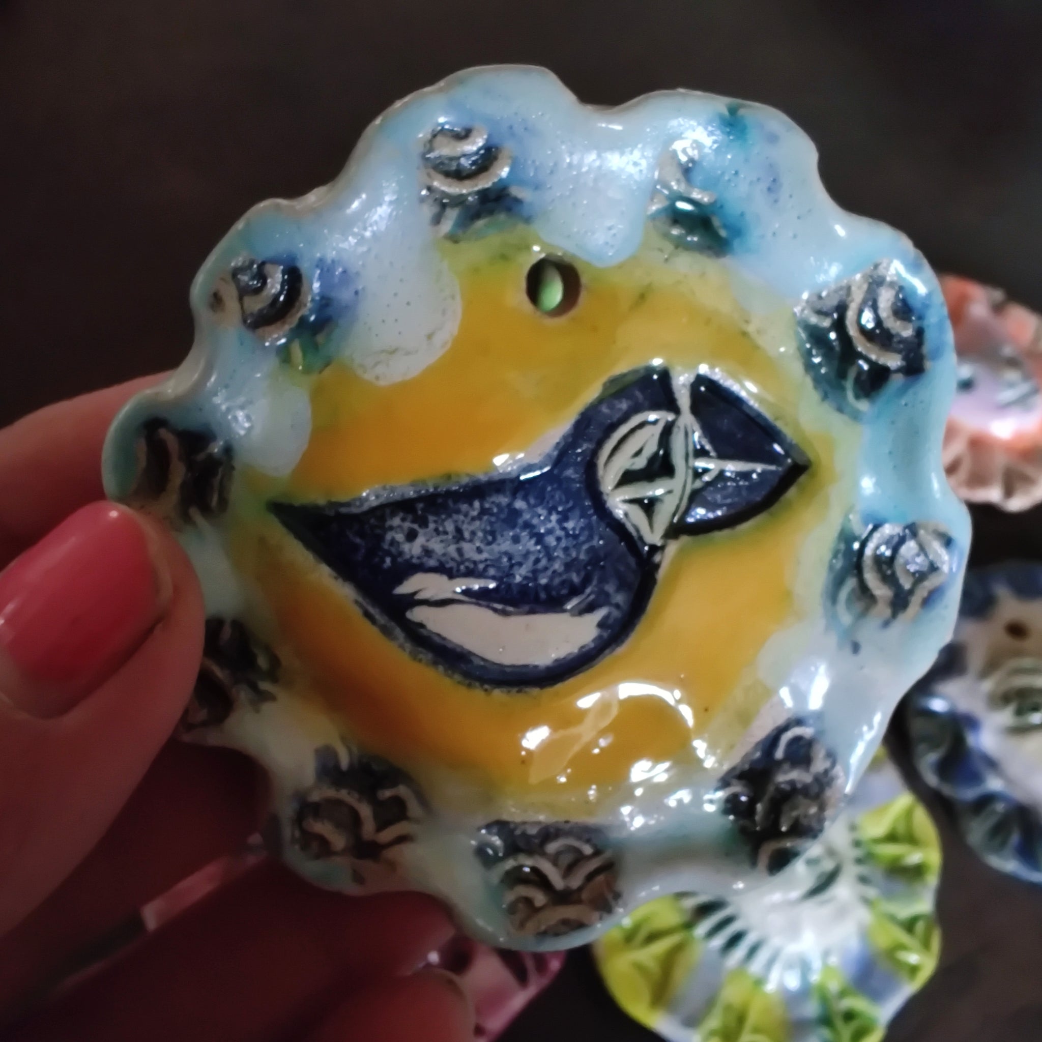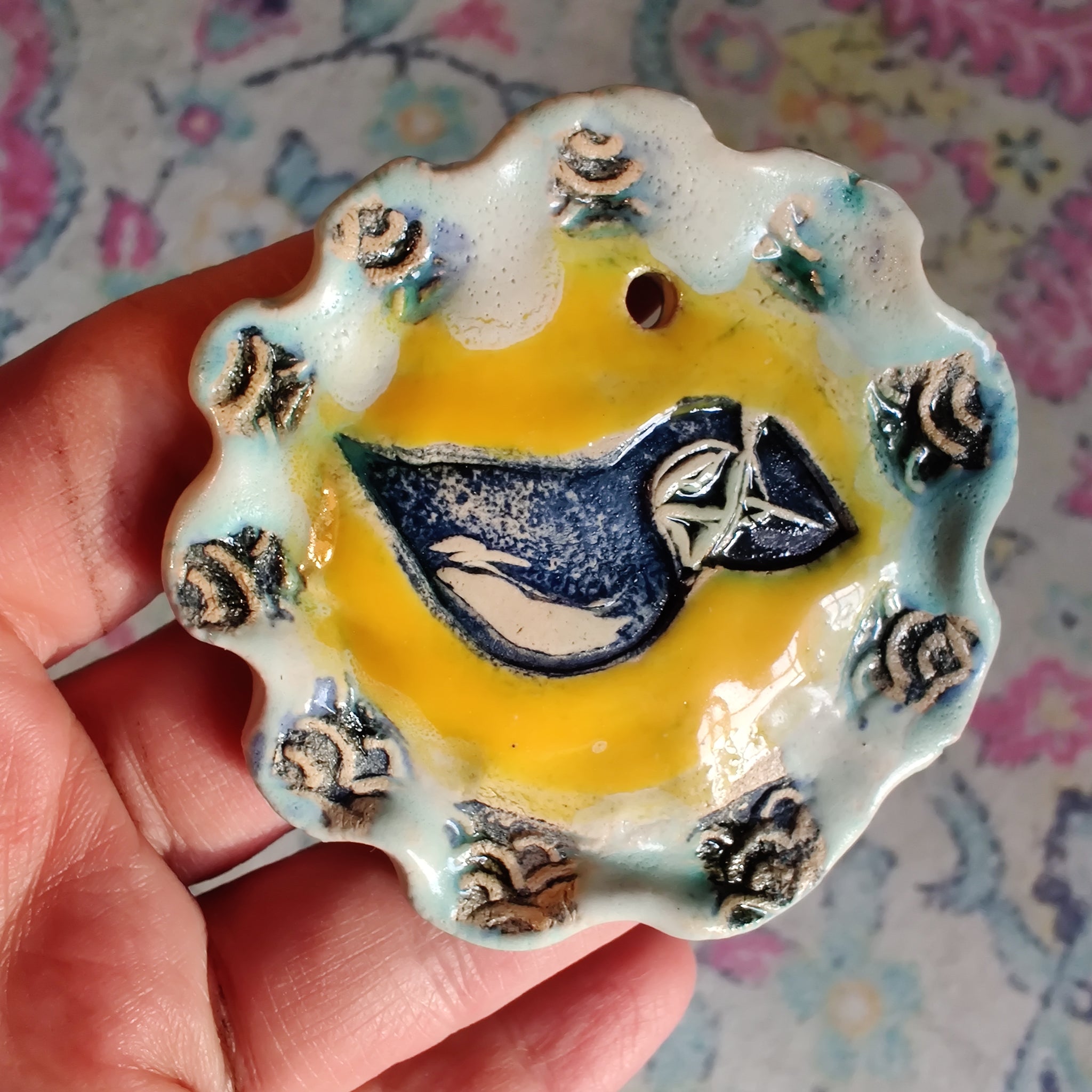 Et lille rundt ornament til juletræet eller lignende. Det er glaseret på alle sider, så det kan hænge frit.