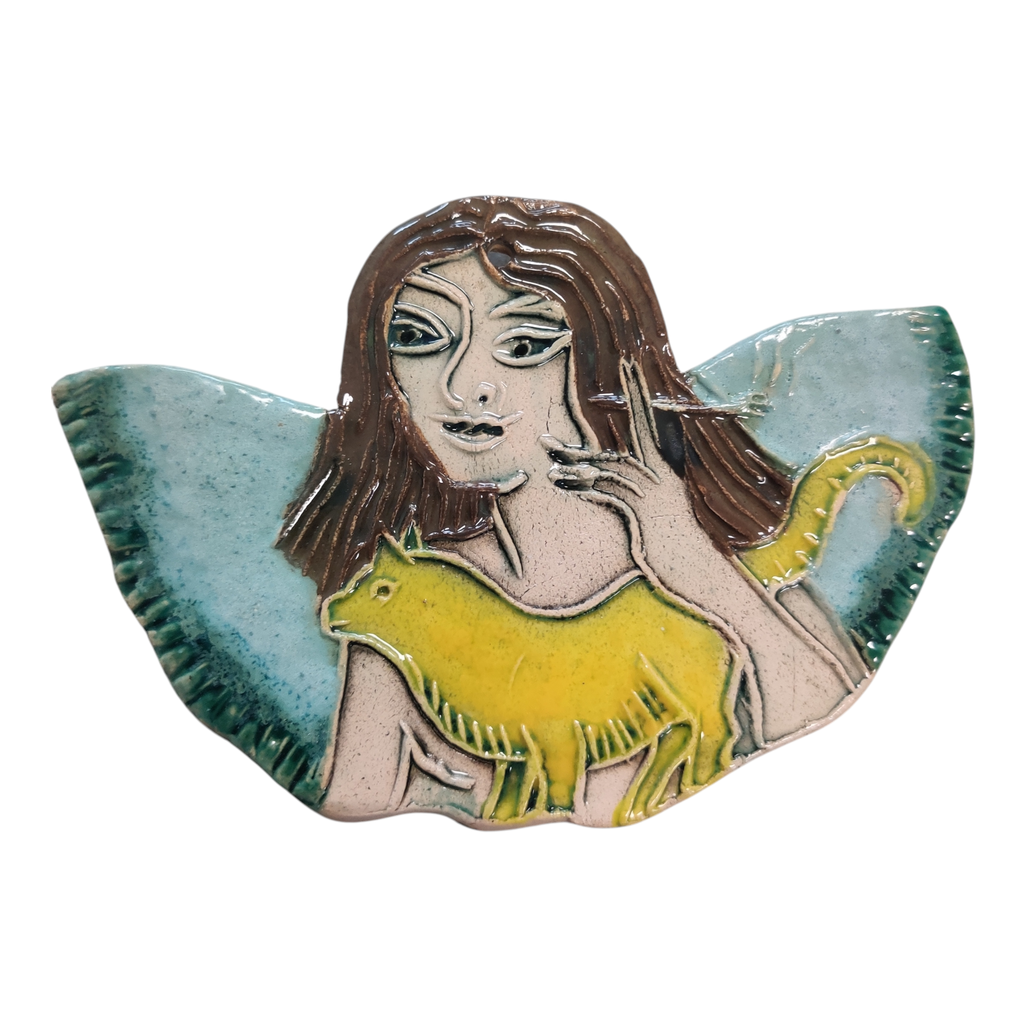 - lavet i lertøj og glaseret på den ene side, og har en håndtegnet engel på bagsiden.Velegnet til at hænge på et lille søm på væggen eller frit på en gren.
