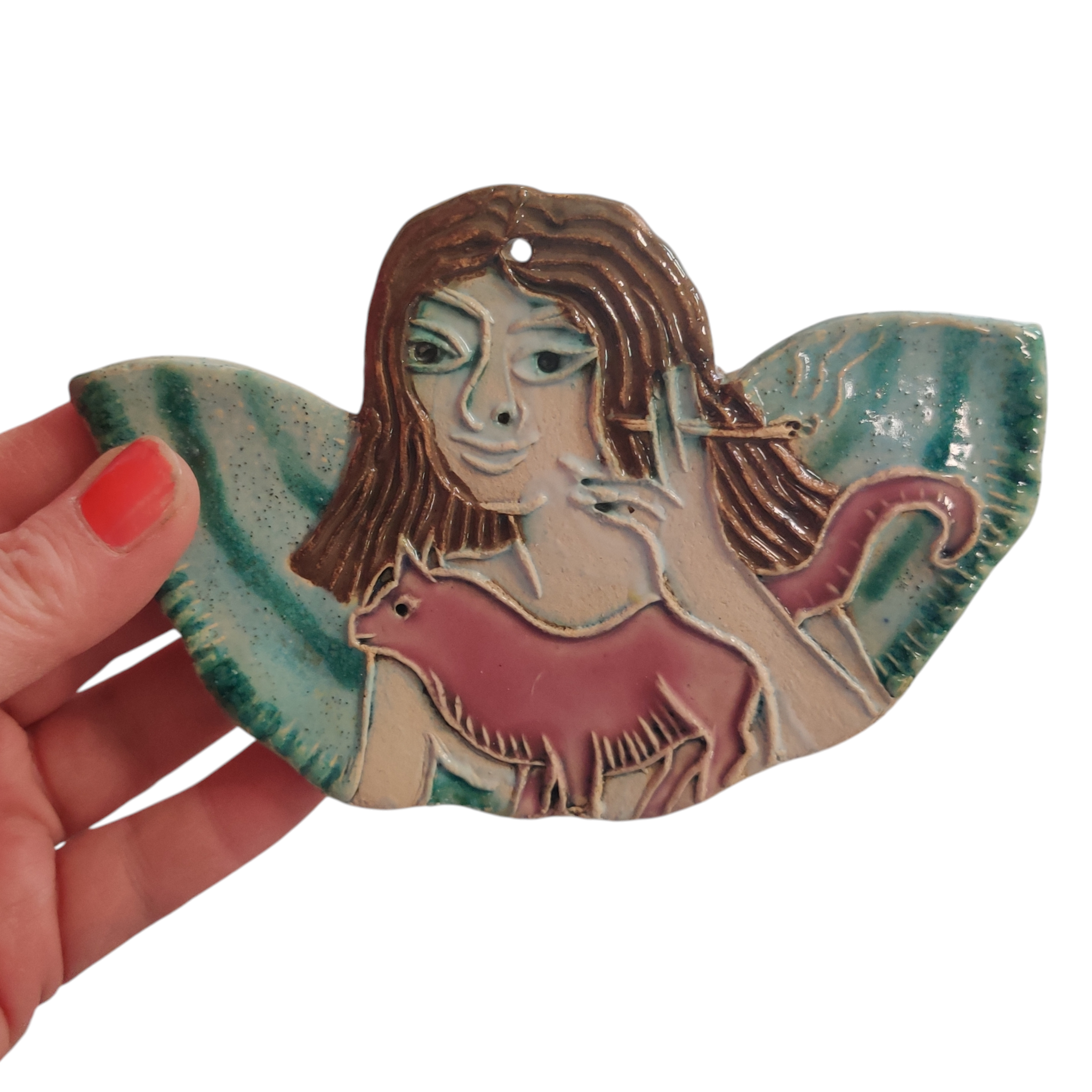 - lavet i lertøj og glaseret på den ene side, og har en håndtegnet engel på bagsiden.Velegnet til at hænge på et lille søm på væggen eller frit på en gren.