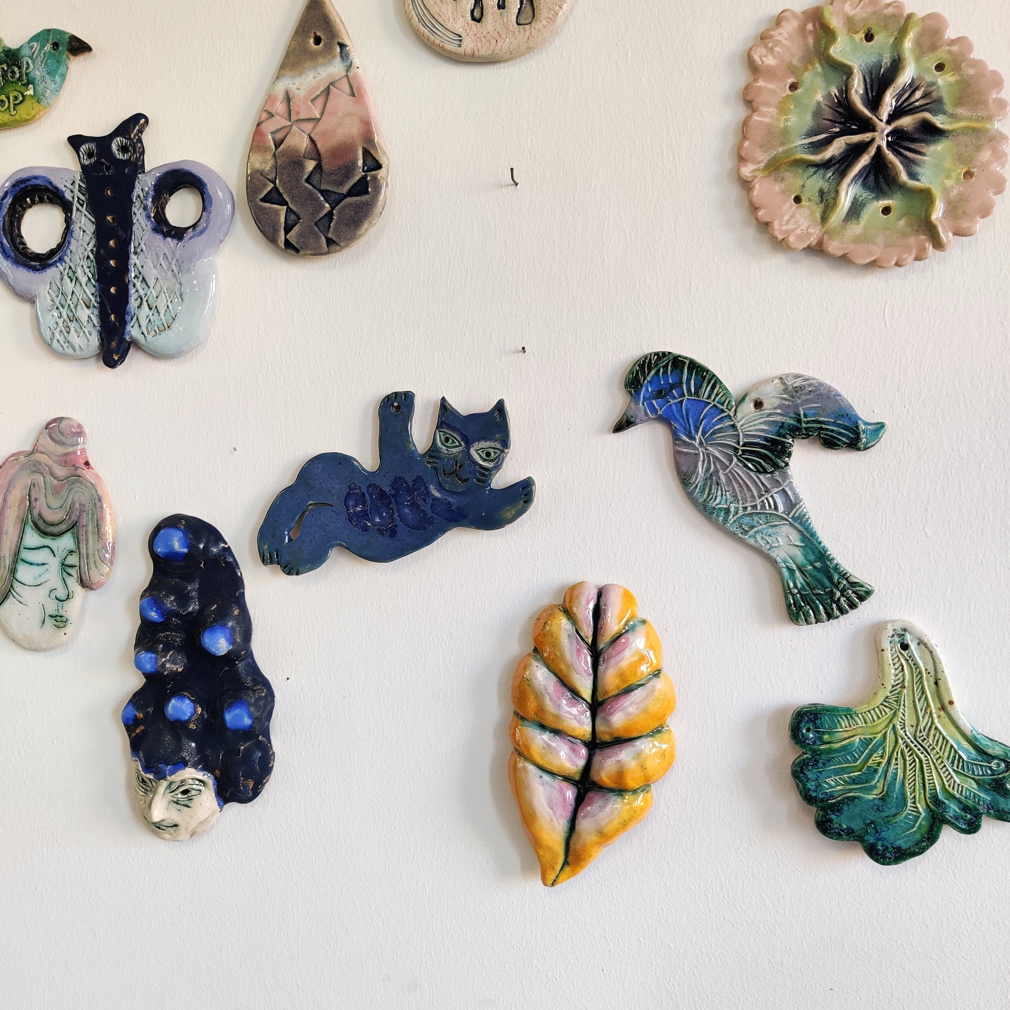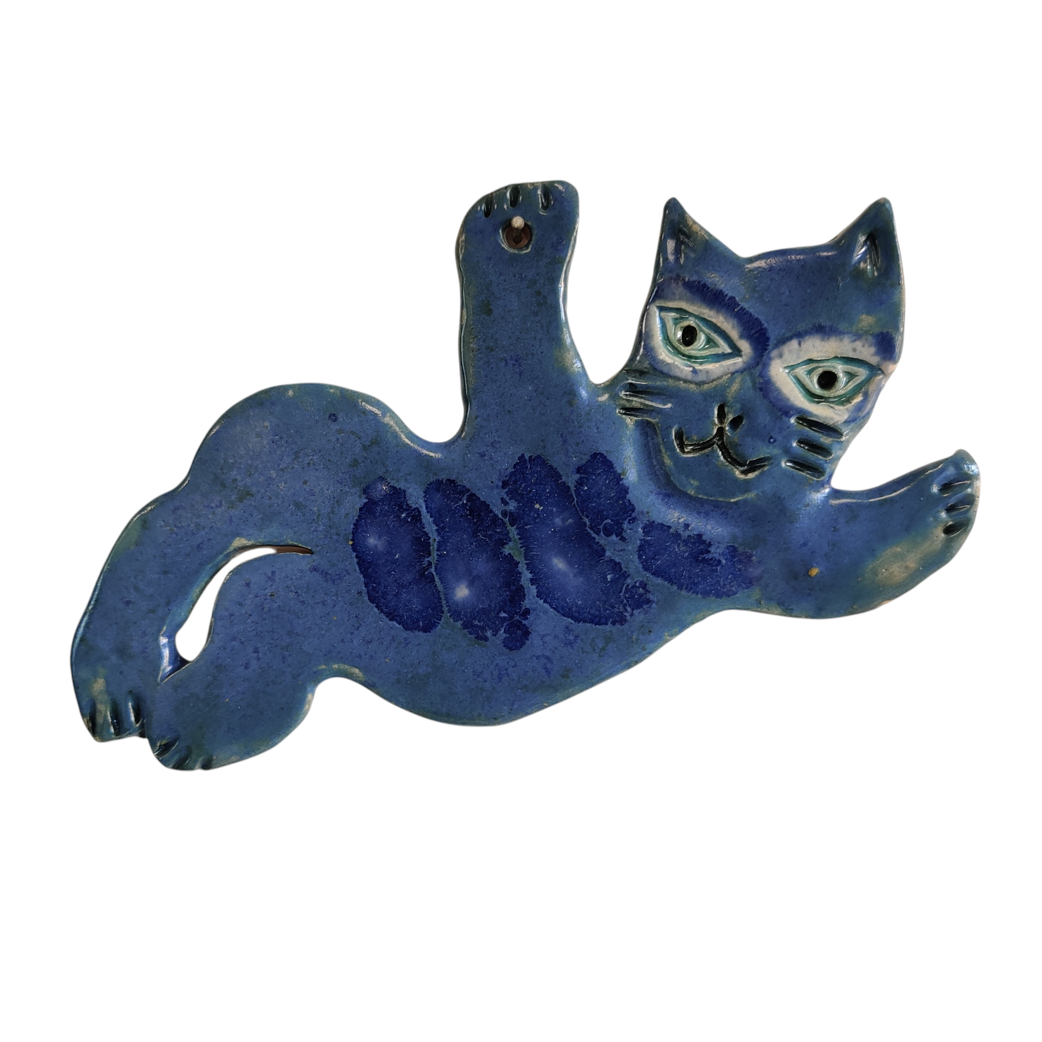 Et objekt til at hænge på væggen. Det er i lertøj, glaseret på den ene side og måler ca. 8,5 x 16 cm.