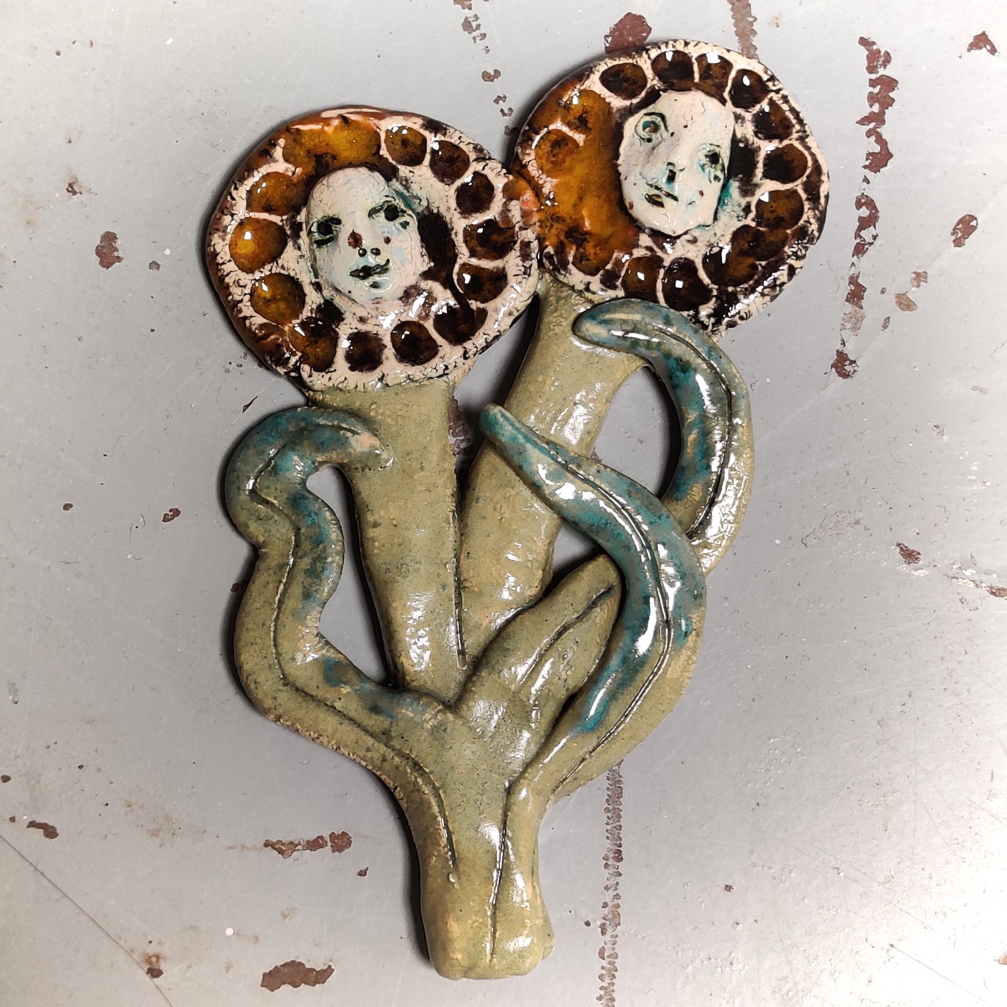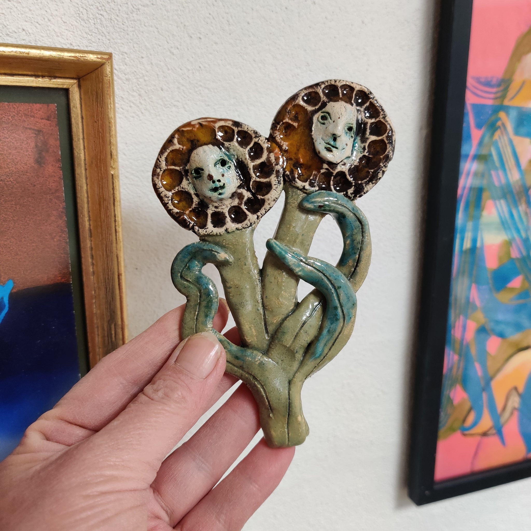 En væghængt evighedsblomst i lertøj. Den er glaseret på den ene side, og den er ca. 14 cm lang.