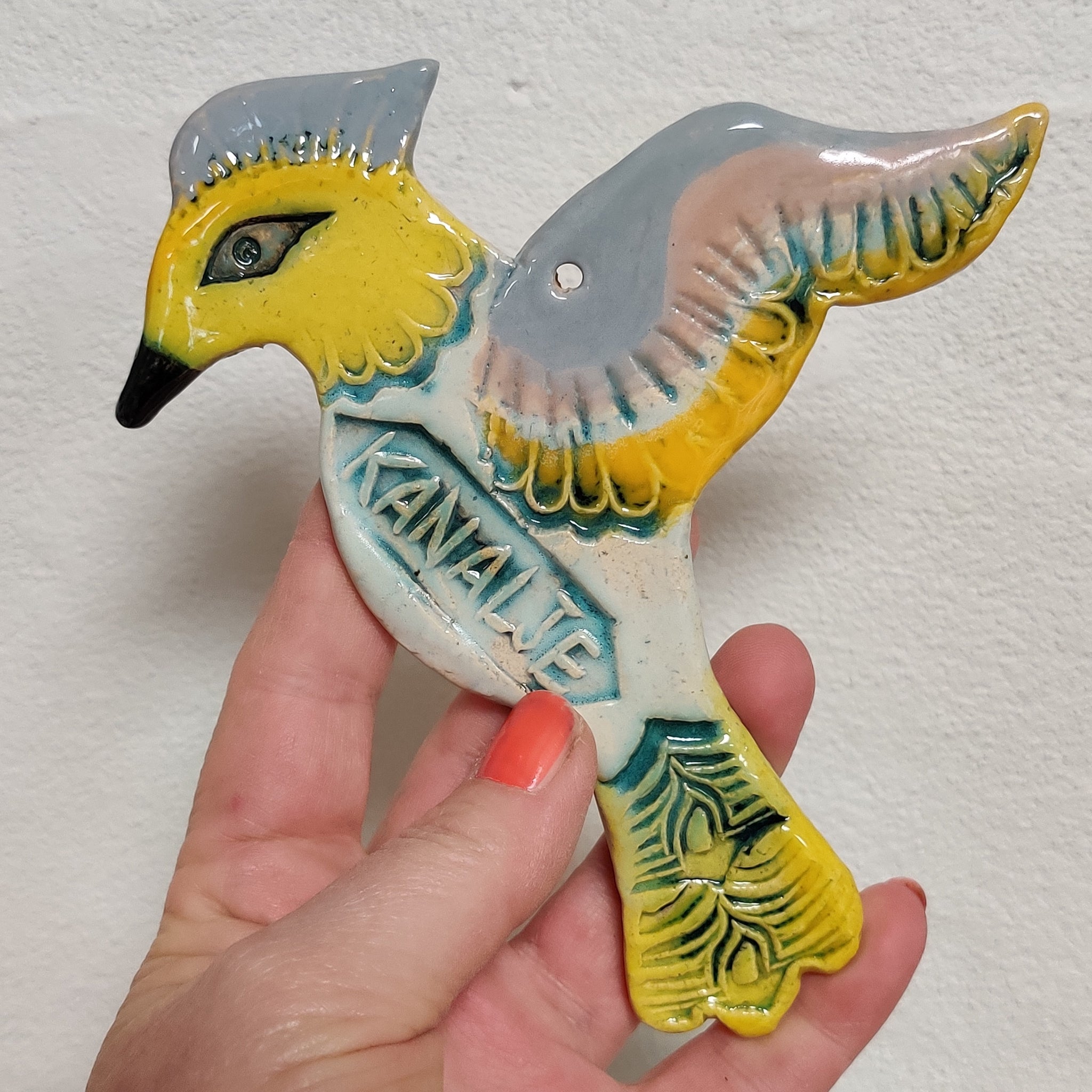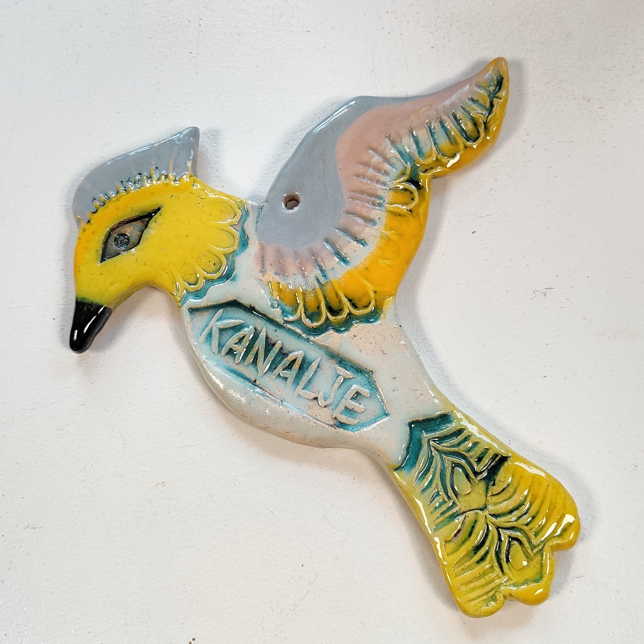 En fugl til at hænge på væggen. Den er i lertøj, glaseret på den ene side, og den er ca. 15 cm lang.