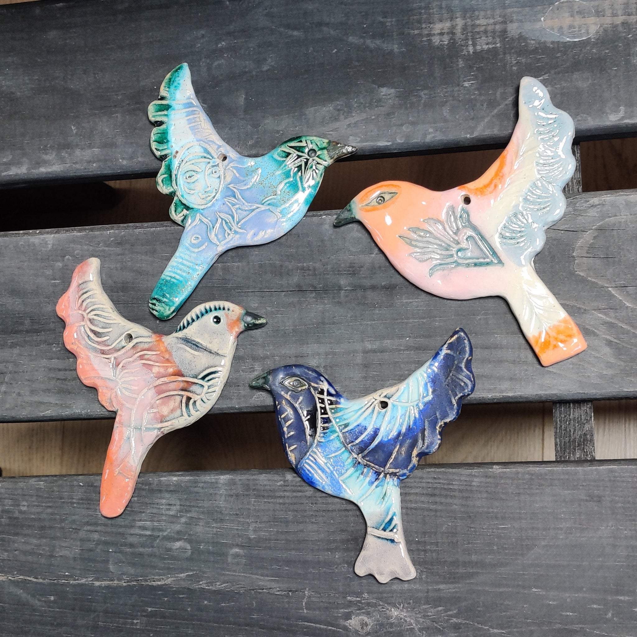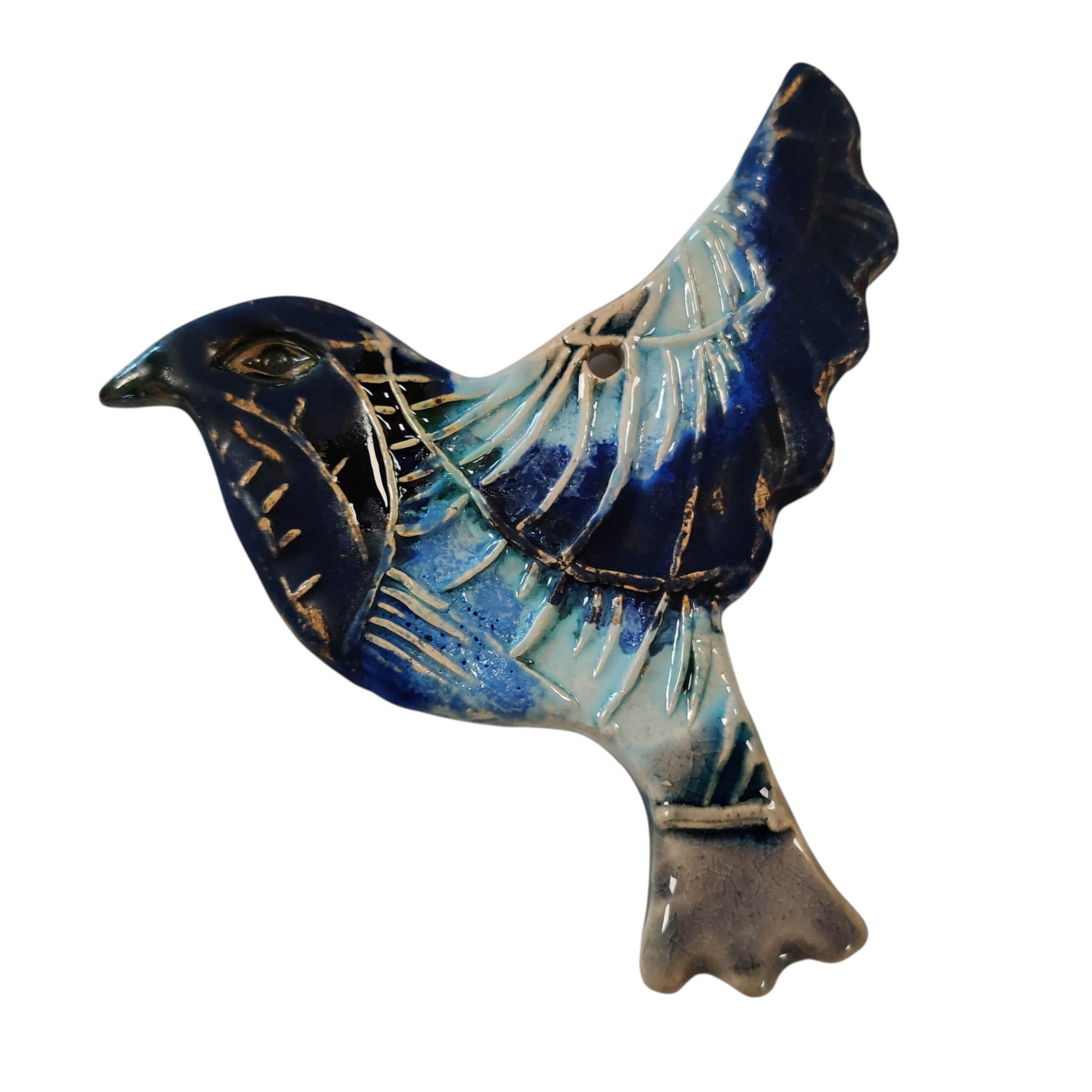 En fugl til at hænge på væggen. Den er i lertøj, glaseret på den ene side, og den er ca. 12 cm lang.