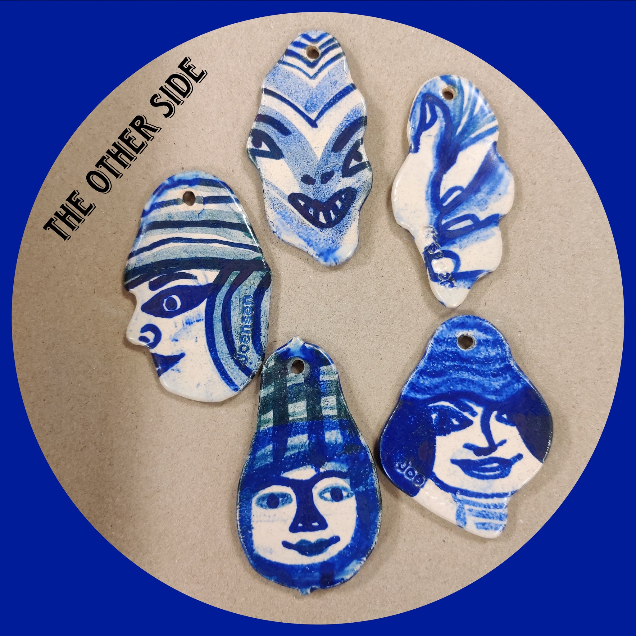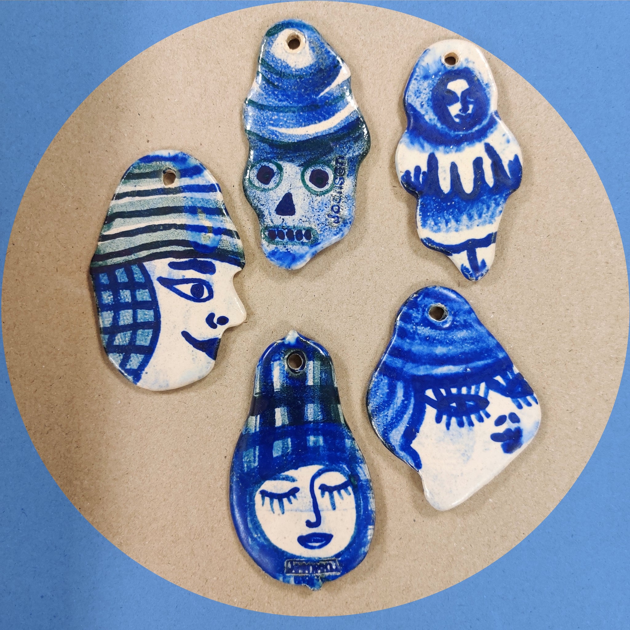 En juleflok ( eller rettere helårsflok) bestående af 5 ophæng med glasur på begge sider. De har en snor på og er lige til at hænge på et juletræ, en gren, i vinduet eller lign.