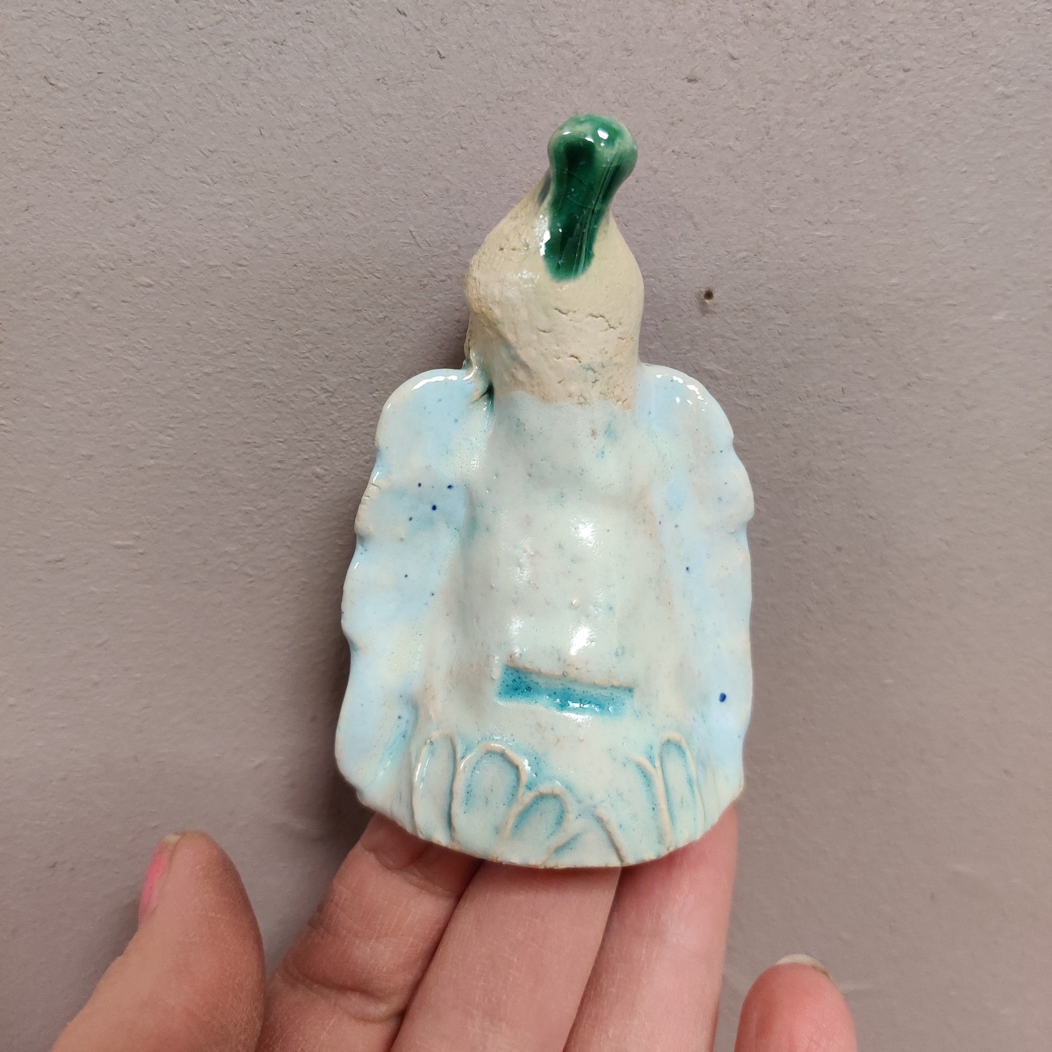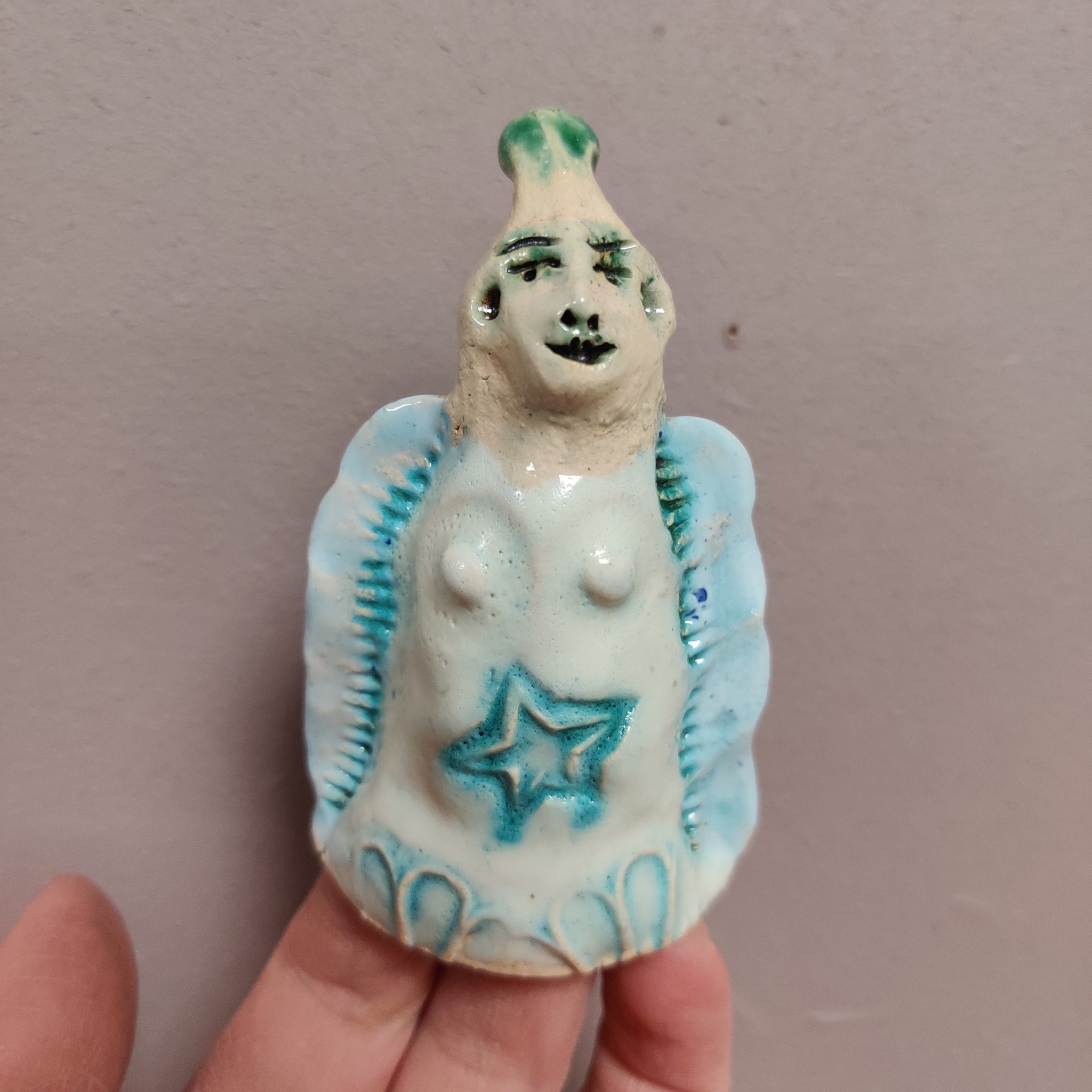 En engel i lertøj. Den er ca. 7,5-8 cm høj.
