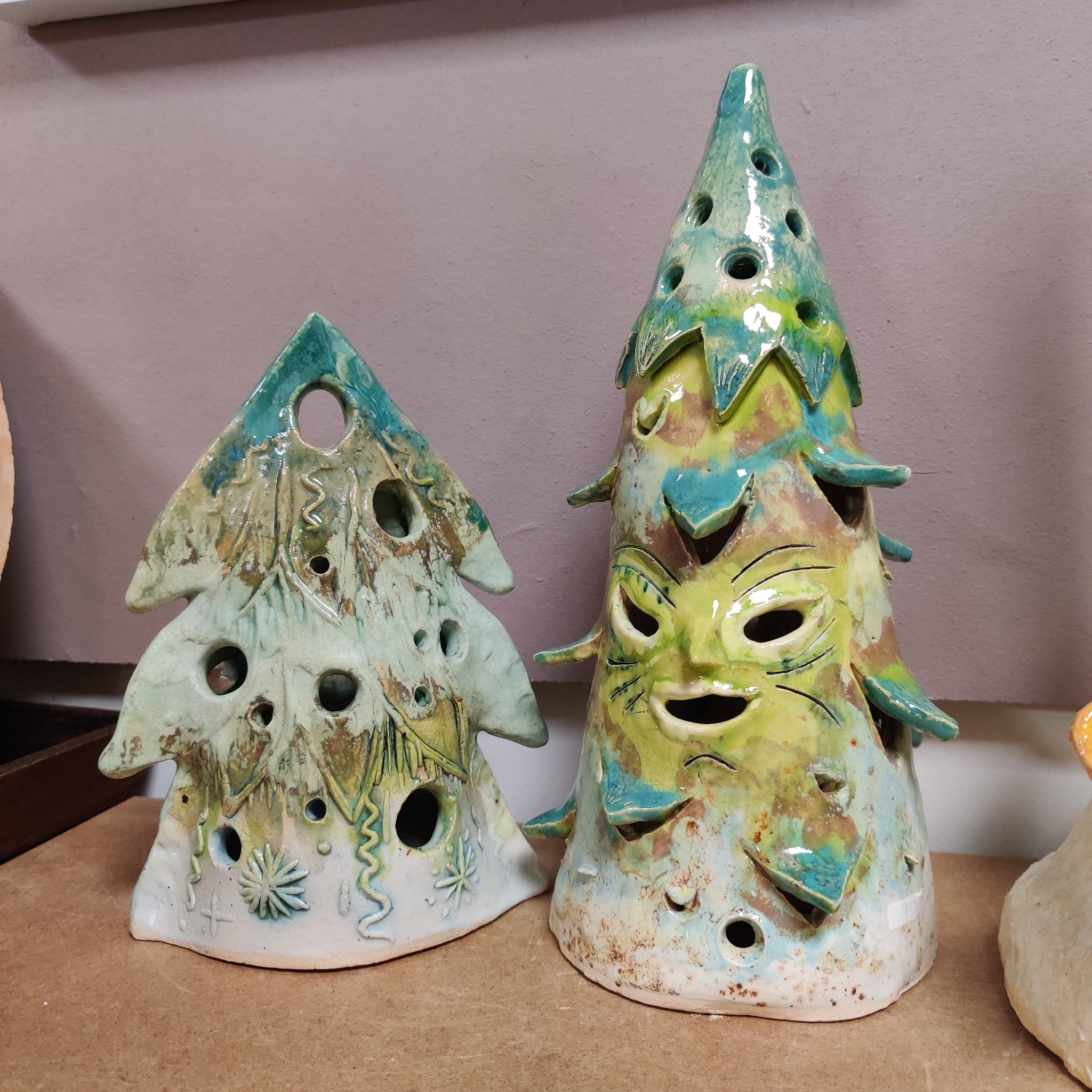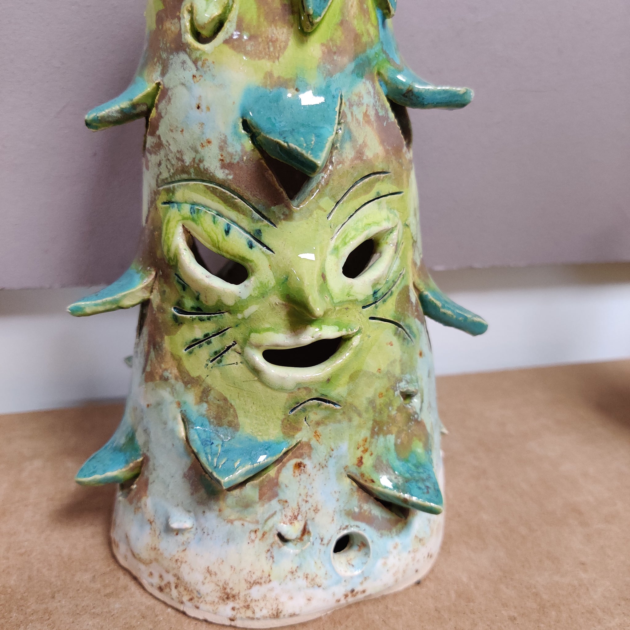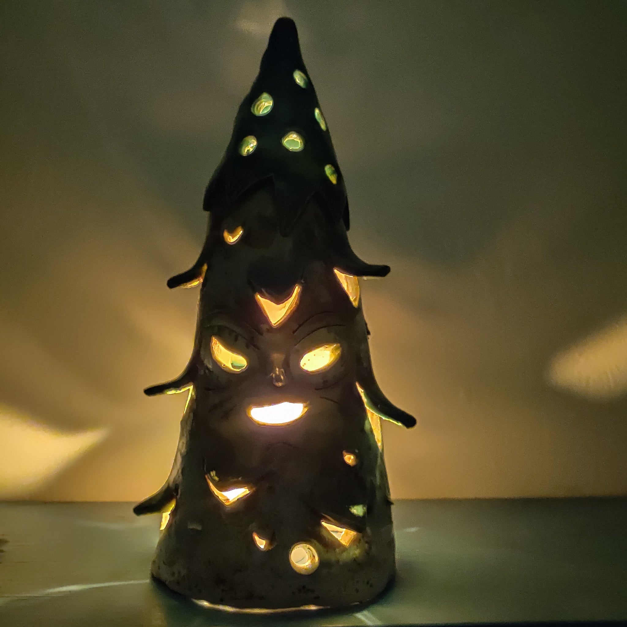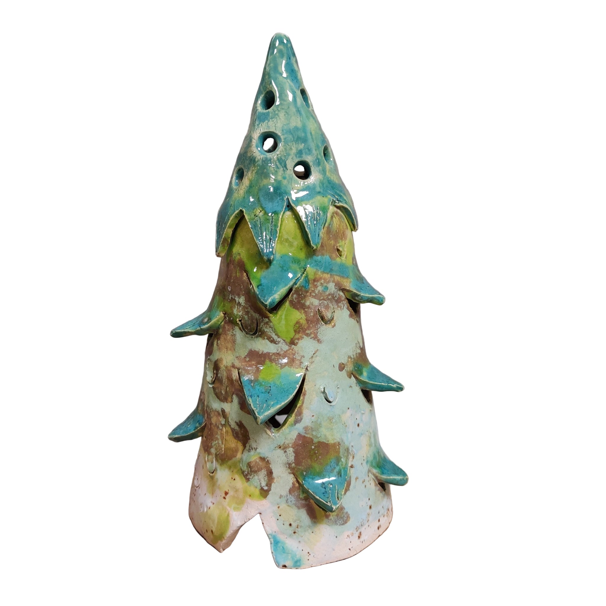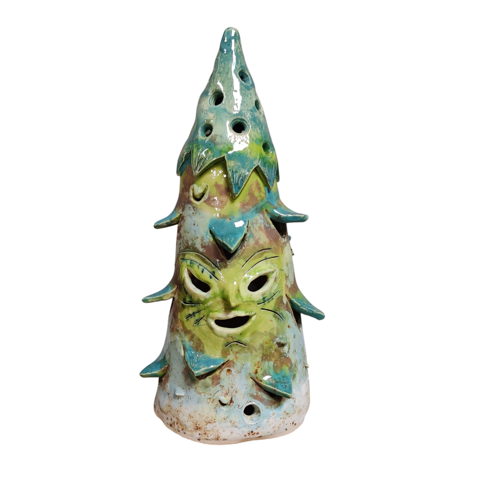 En stor skulpturel fyr i lertøj. Indeni er der plads til et LED-fyrfadslys eller en lille lyskæde.