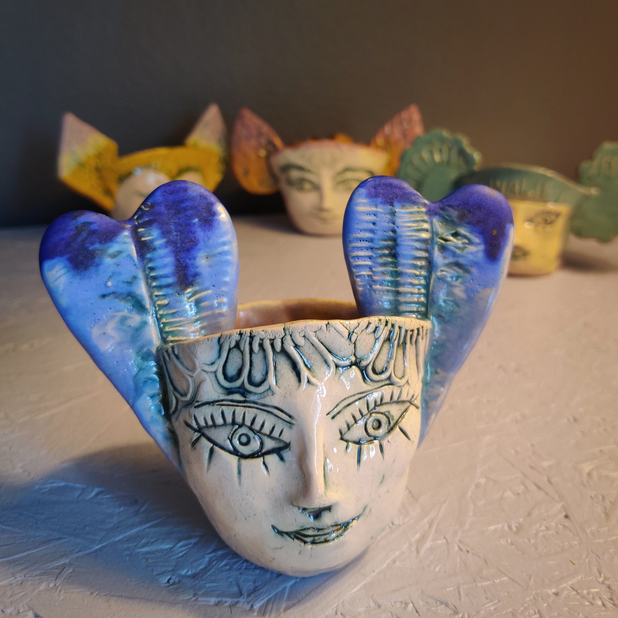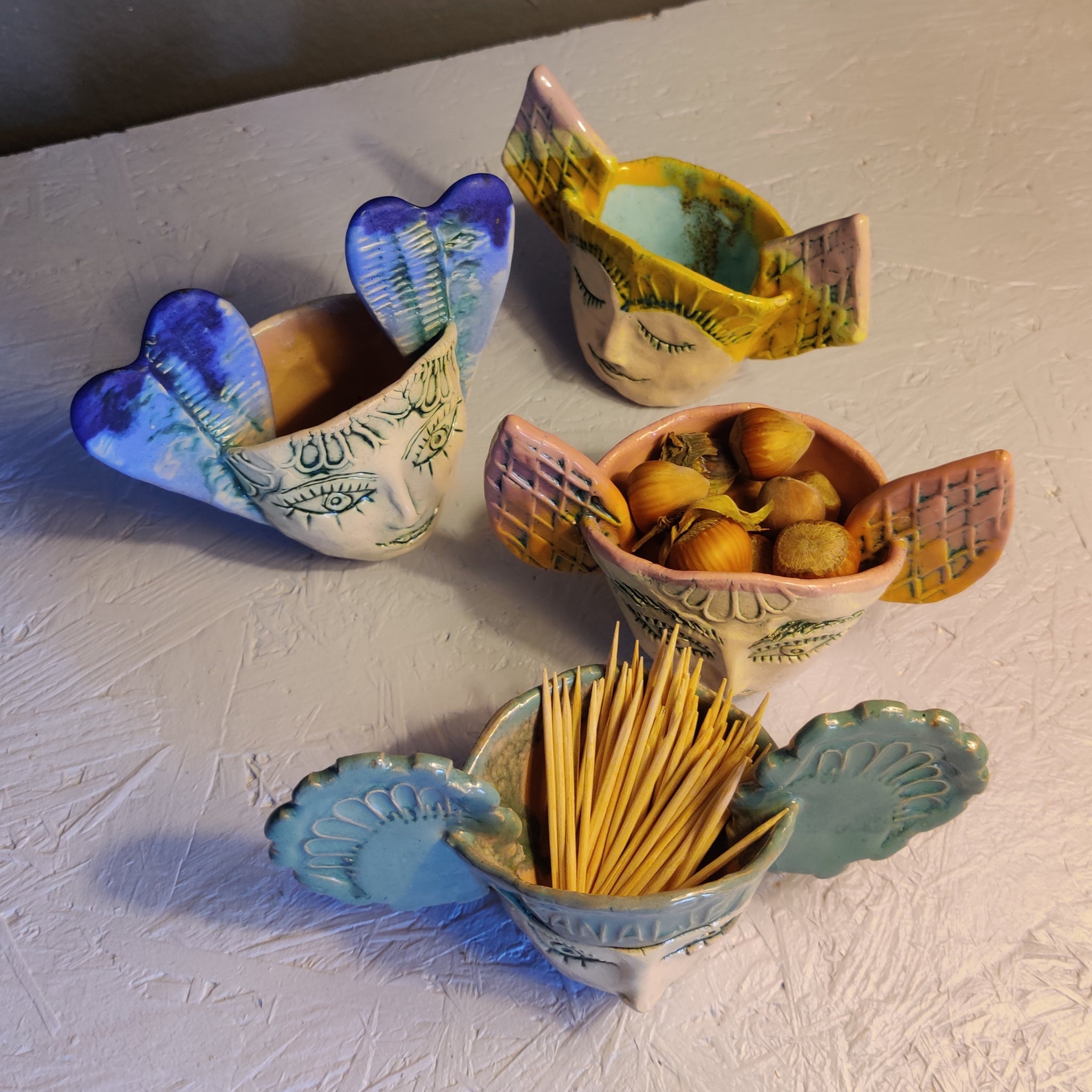 En skål i lertøj. Den kan bruges til nødder, sukker, salt, bolcher, tandstikker, smykker og meget mere. Den er ca. 12 cm bred (ydre mål)