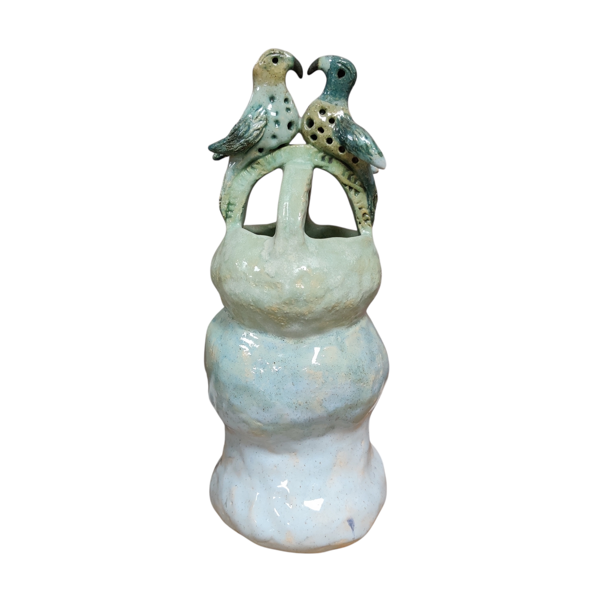 En stor vase med to kærlige fugle, som danner et hjerte med deres næb. Vasens krop har et slags ansigt, farverne er hvide, beige, blå og grønne. Bemærk at vasen er i lertøj og den er derfor kun egnet til tørrede blomster, papirblomster og lign.