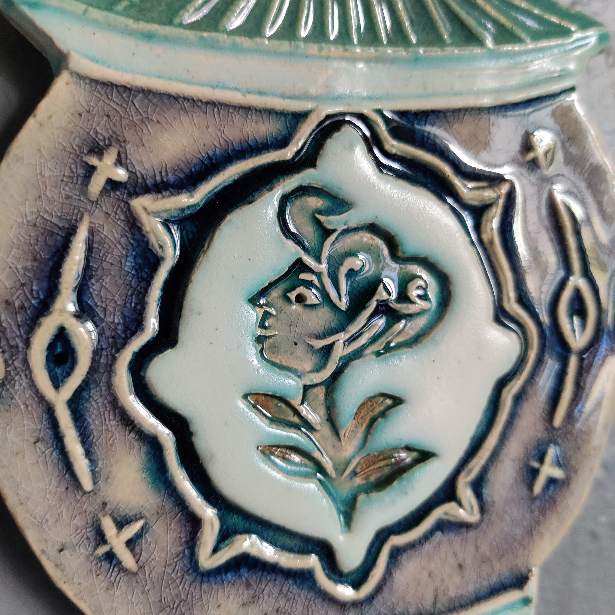 Ornamenter til væggen. De er glaserede på den ene side. De kan hænge direkte på et lille søm eller alternativt med en lille snor i.
