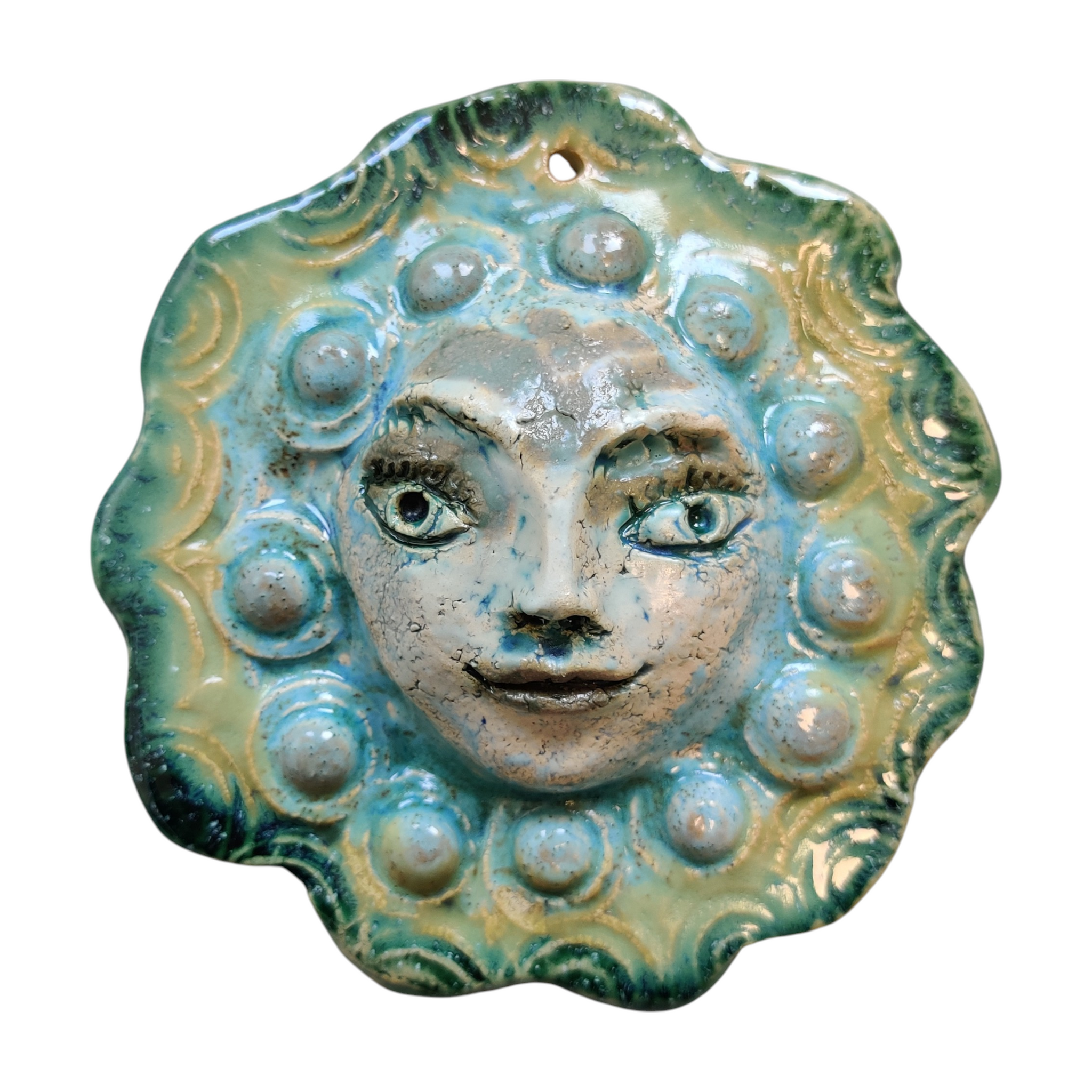 En væghængt sol i lertøj. Den måler ca. 11x12 cm