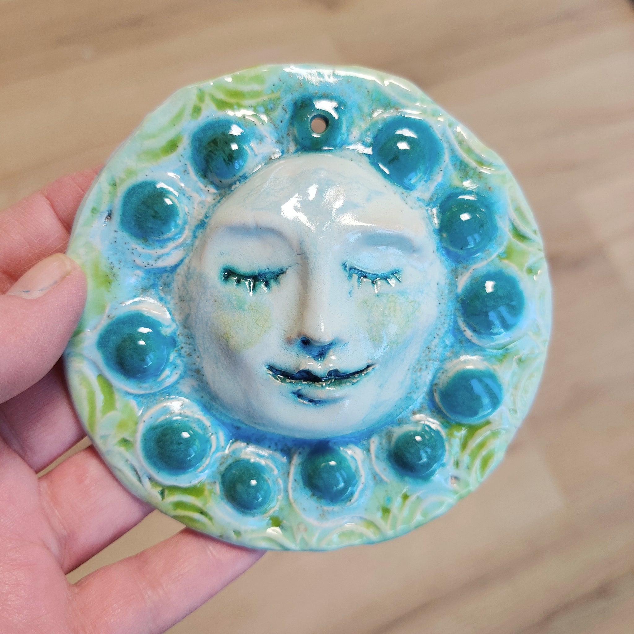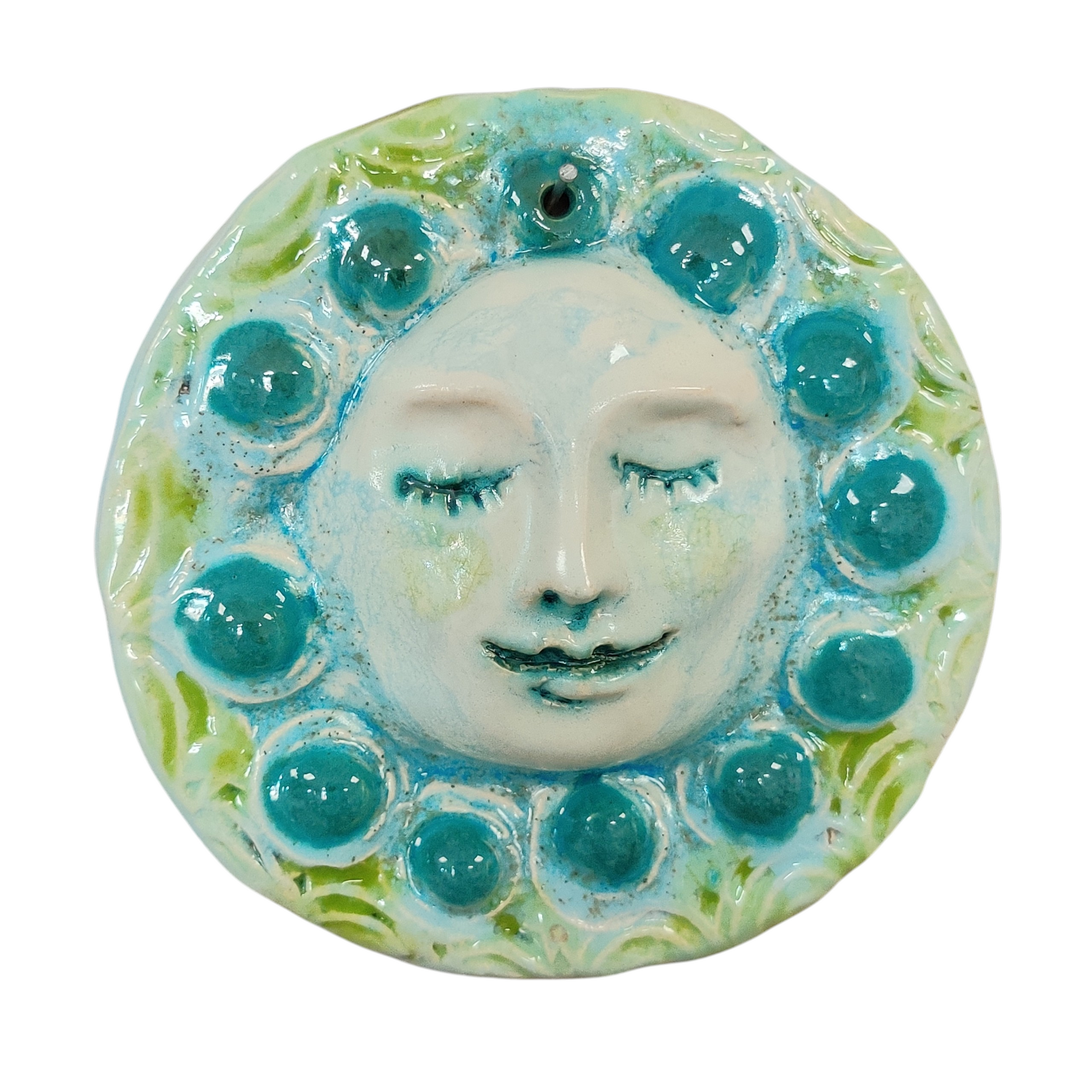 En væghængt sol i lertøj. Den måler ca. 10,8x10,5 cm