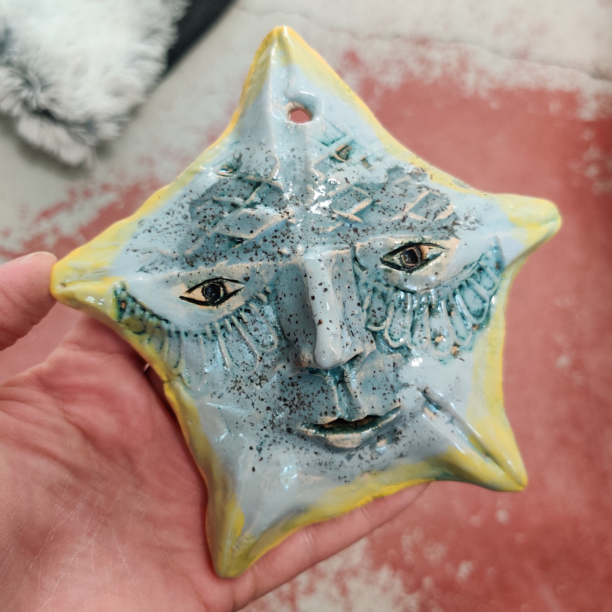 Et objekt til at hænge på væggen. Det er i lertøj, glaseret på den ene side og måler ca.13x13cm